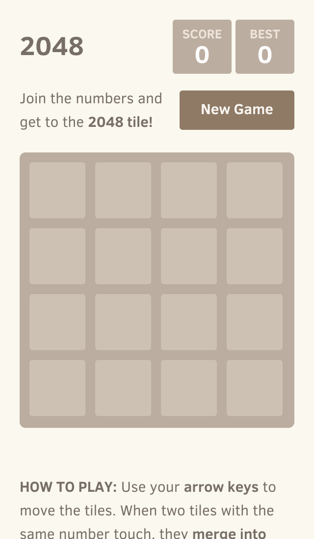 遊び方: 矢印キーを使ってタイルを動かします。同じ数字のタイルが触れると、1つのタイルに合体します!